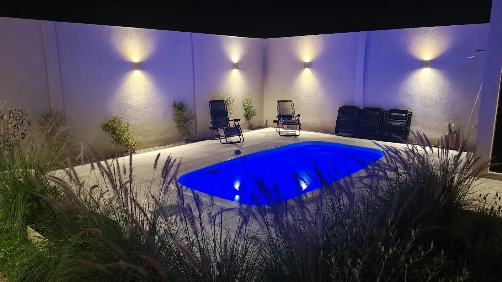 Un espacio moderno al aire libre con reposeras y sombrillas.